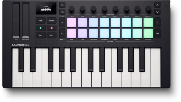 Launchkey Mini 25 is a compact and powerful DAW controller equipped with a suite of onboard creation tools. Every aspect is designed to enhance your creative flow, from the synth-style mini-keybed and 16 pads with polyphonic aftertouch, to the control surface, which enables intuitive DAW integration.