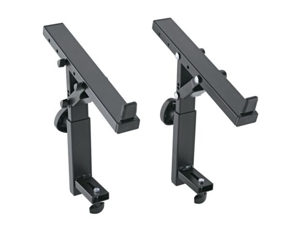 Stacker for the 3rd level of the keyboard stands »Omega-E« 18800, »Omega« 18810 and »Omega Pro« 18820. The stacker is easily and quickly positioned to the desired height by a spring-loaded clamping knob. In addition, depth and inclination adjust in various positions. This stacker can only be used in conjunction with the 18811 stacker. A rubberised stop provides the necessary safety and prevents the keyboard from slipping.